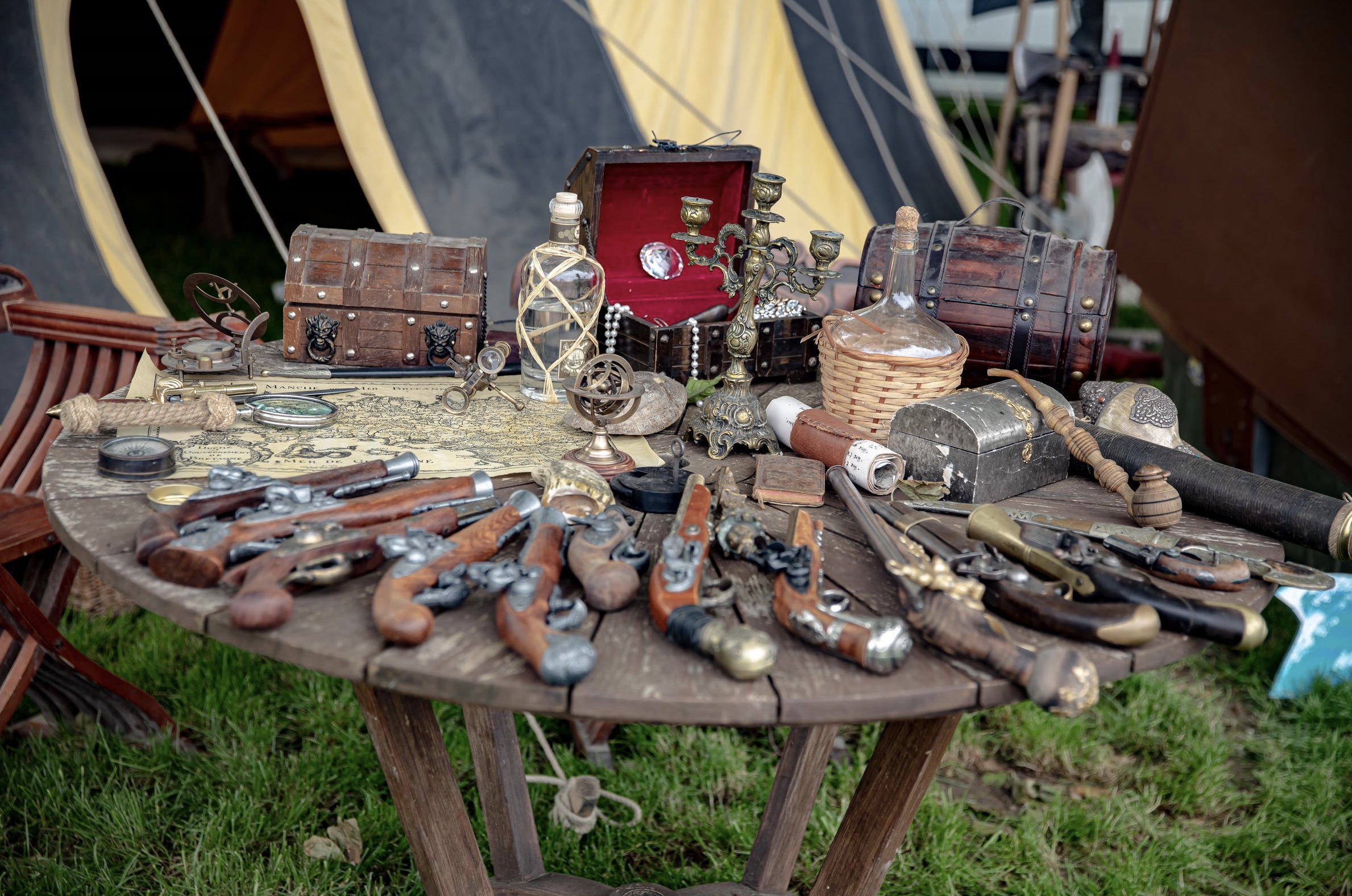 Voici la pièce maîtresse de votre ambiance pirate : le bureau du capitaine. Véritable cabinet de curiosités marines, il plonge le public dans l’univers de la piraterie à travers une profusion d’objets rares et précieux collectés au fil des aventures.