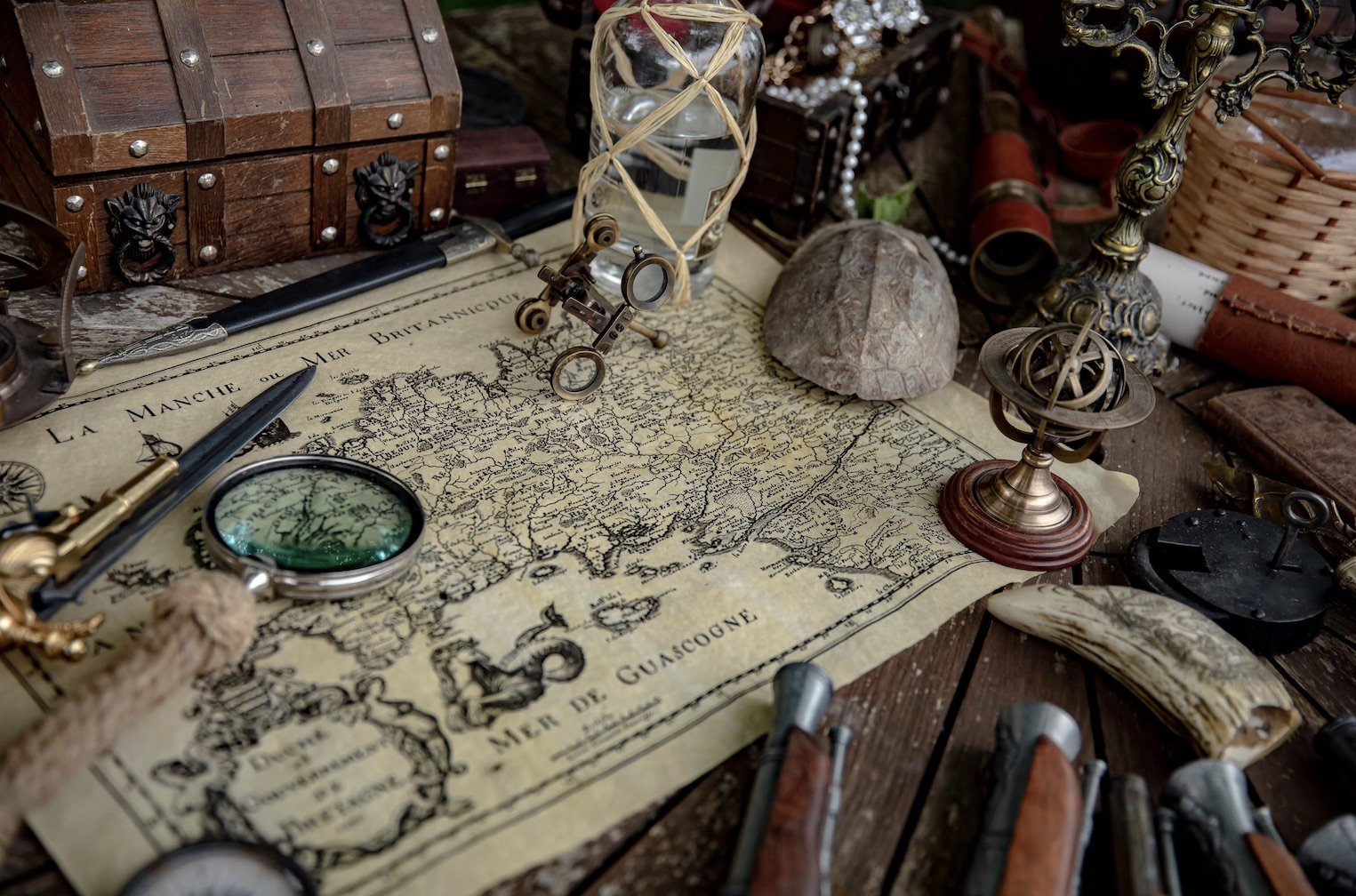 Cartes anciennes, instruments de navigation, armes de toutes sortes et trésor du capitaine composent un décor riche, immersif et fascinant.